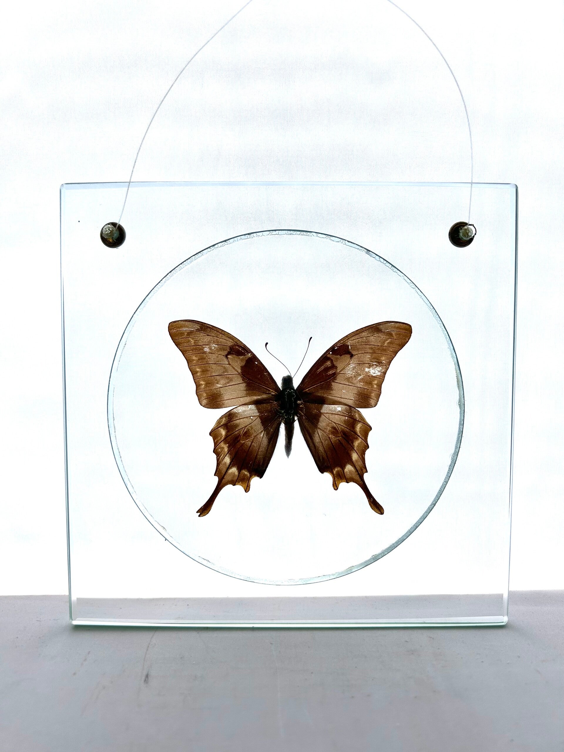 Grote tropische vlinder in doorkijkkader 'meandrusa sciron'Glazen kader met bol glas!intact L x B 16 x 16cm
